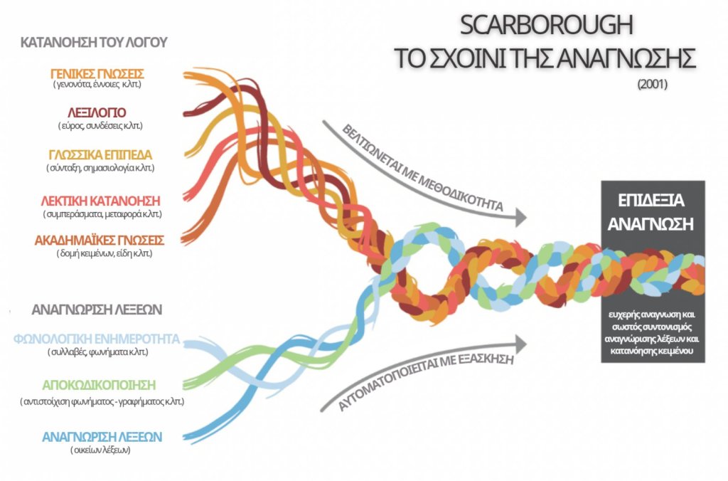 Η σχέση μεταξύ ομιλίας, λόγου και ανάγνωσης είναι ένα πολύπλοκο συνυφασμένο «σχοινί» σχετικών δεξιοτήτων. Όπως απεικονίζεται στη παρακάτω εικόνα του The Reading Rope (2001) του Dr Scarborough, υπάρχουν αρκετές δεξιότητες που πρέπει να κατακτήσει ένα παιδί πριν ξεκινήσει να συλλαβίσει και στη συνέχεια να διαβάζει. Αυτές οι δεξιότητες παρουσιάζονται ως κλωστές ή σκέλη ενός σχοινιού που τελικά συμπλέκονται καθώς το παιδί αποκτά ευχέρεια και μπορεί να αναγνωρίσει λέξεις και να κατανοήσει το κείμενο. Εάν, ωστόσο, υπάρχει κάποια σπασμένη κλωστή (ή δεν κατακτηθεί η ικανότητα), το σχοινί μπορεί να γίνει αδύναμο.